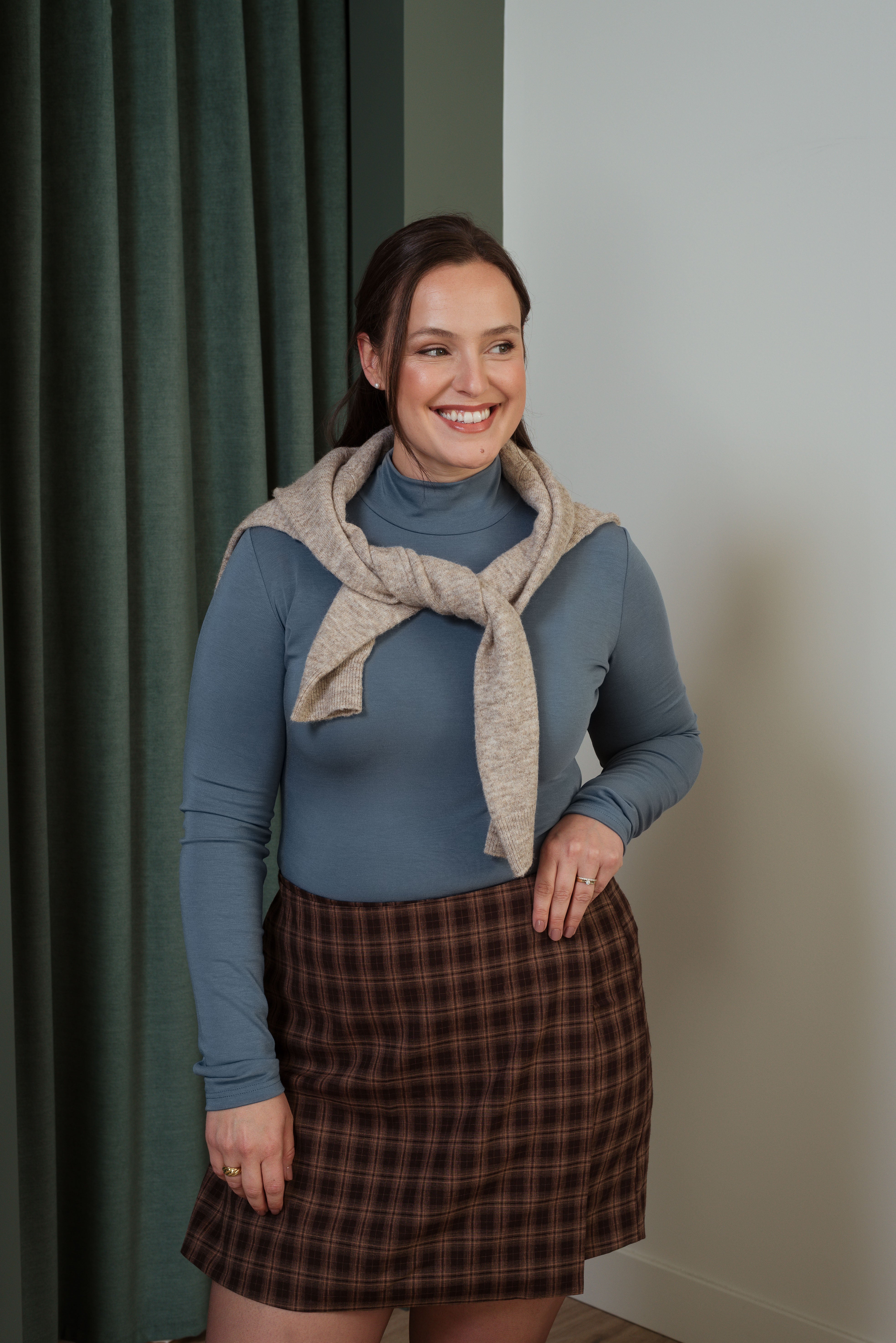 Facile à agencer avec un col roulé, un chemisier ou un simple tricot, elle deviendra rapidement un incontournable de votre garde-robe automnale.